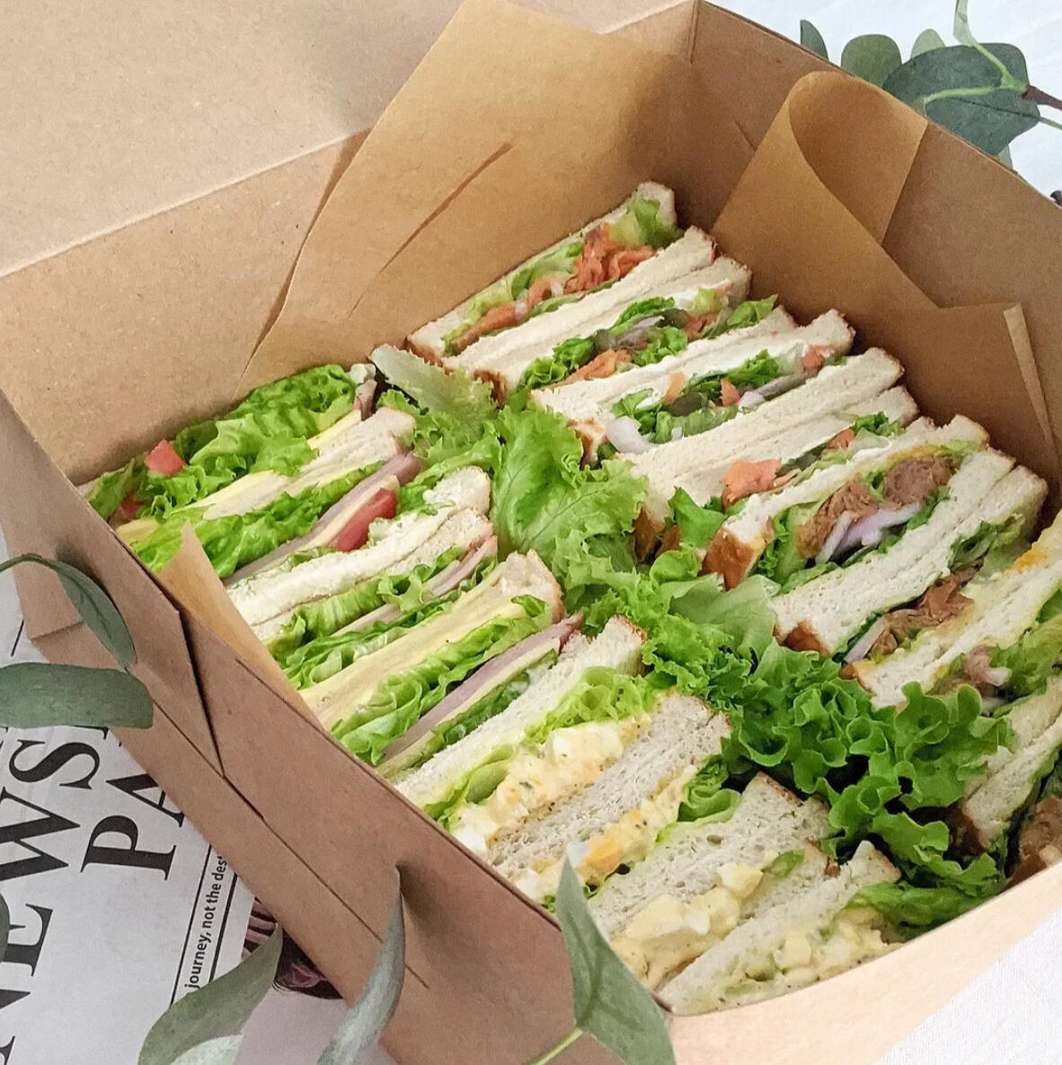 The ultimate sandwich experience with our Gourmet Sandwiches Box, featuring an assortment of 4 delicious flavors. Each box contains 16 pieces, with 8 sandwiches cut into halves, perfect for sharing or satisfying a big appetite.Flavors: