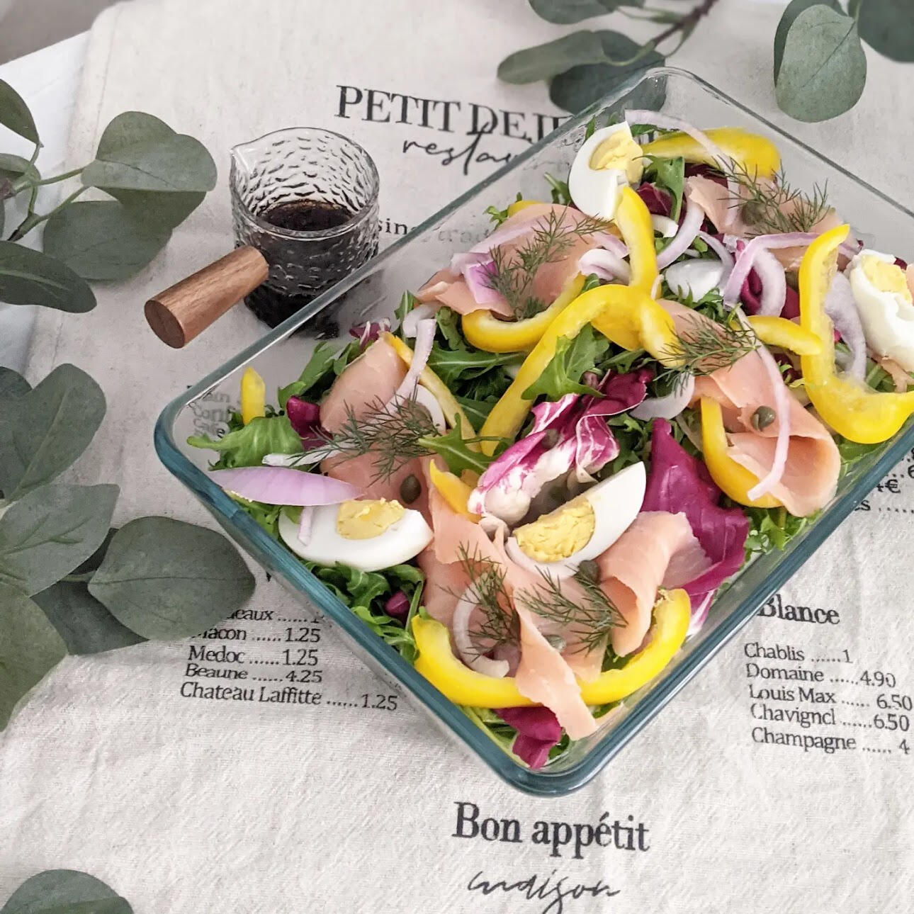 Our Smoked Salmon Salad, a vibrant and refreshing blend of flavors and textures. Our signature salad features a medley of fresh greens, colorful capsicum, zesty red onions, briny capers, and aromatic dill herbs, all perfectly balanced by sliced premium smoked salmon and boiled eggs. The crowning glory is our signature homemade house dressing, carefully crafted to bring out the best in every ingredient.Highlights:Fresh and colorful ingredients